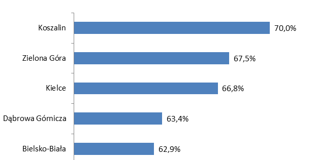 Najniższe wartości natomiast obserwuje się w Opolu – 25,2%, Kaliszu – 28,1%, Białymstoku – 35,1%, Lublinie – 36%, Gdańsku – 40,1% oraz we Wrocławiu – 40,9%. Warto dodać, że największe polskie miasta: Kraków oraz Warszawa odznaczają się wartościami udziału terenów zieleni powyżej średniej krajowej.